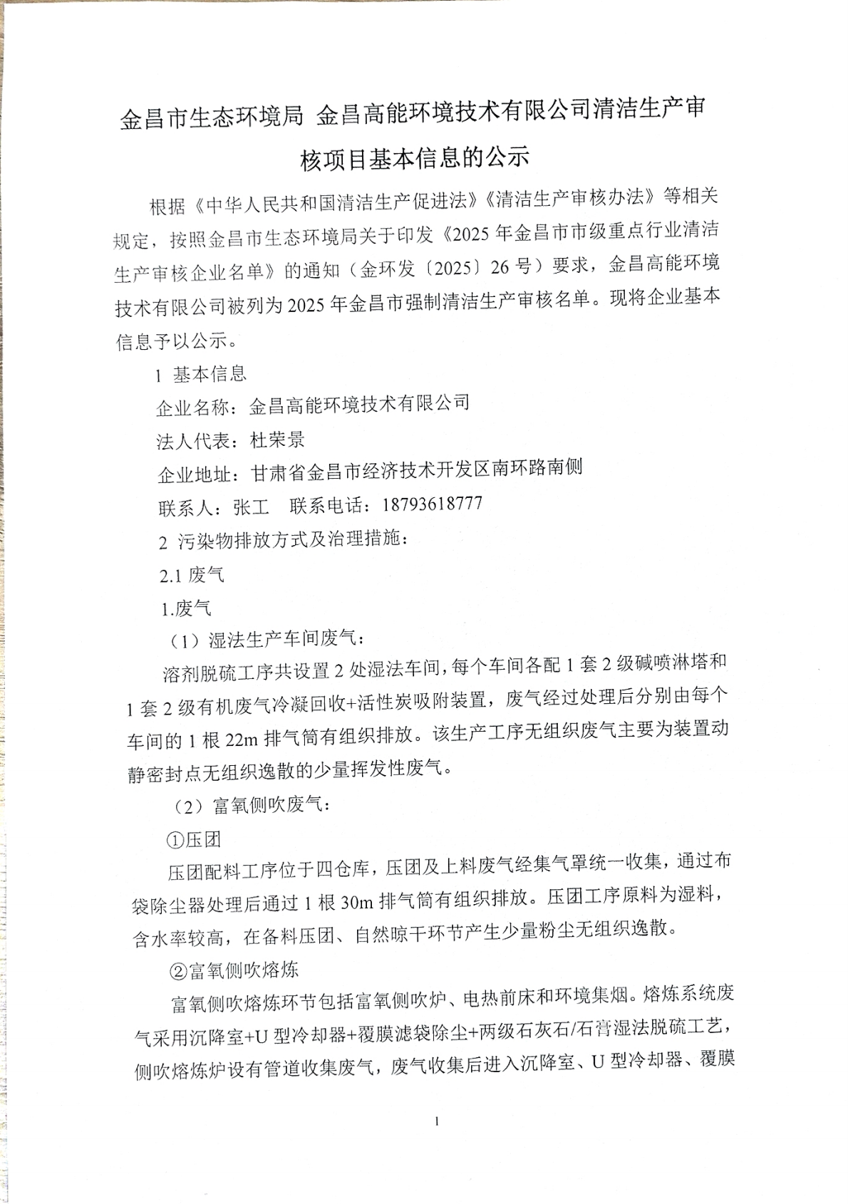 金昌高能清洁生产验收信息公示
