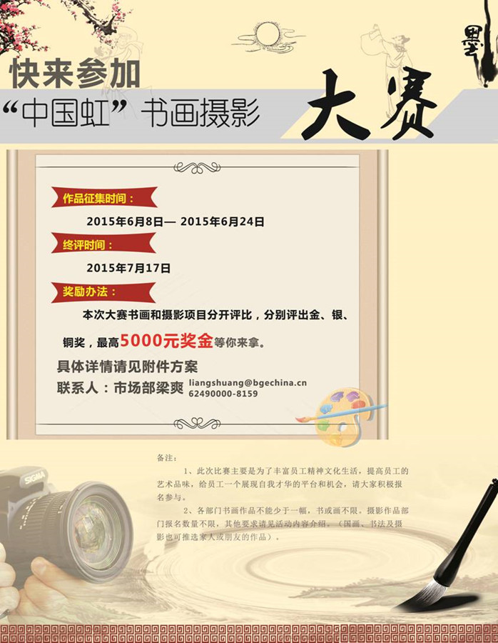 2、各部门书画作品不能少于一幅,书或画不限。摄影作品部门报名数量不限,其他要求请见活动内容介绍。(国画、书法及摄影也可推选家人或朋友的作品)