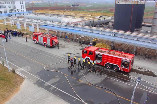 滕州市环保局指导园区数家化工企业于扬子化工进行甲醇精馏塔法兰泄露起火应急救援演练