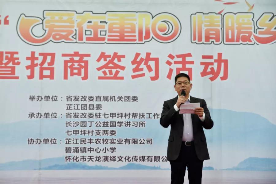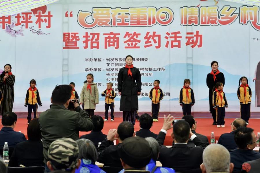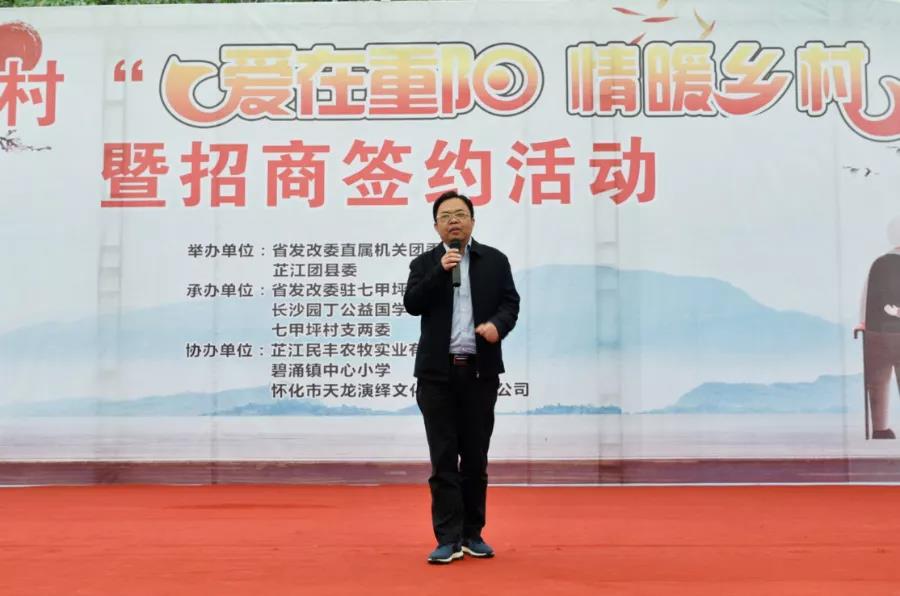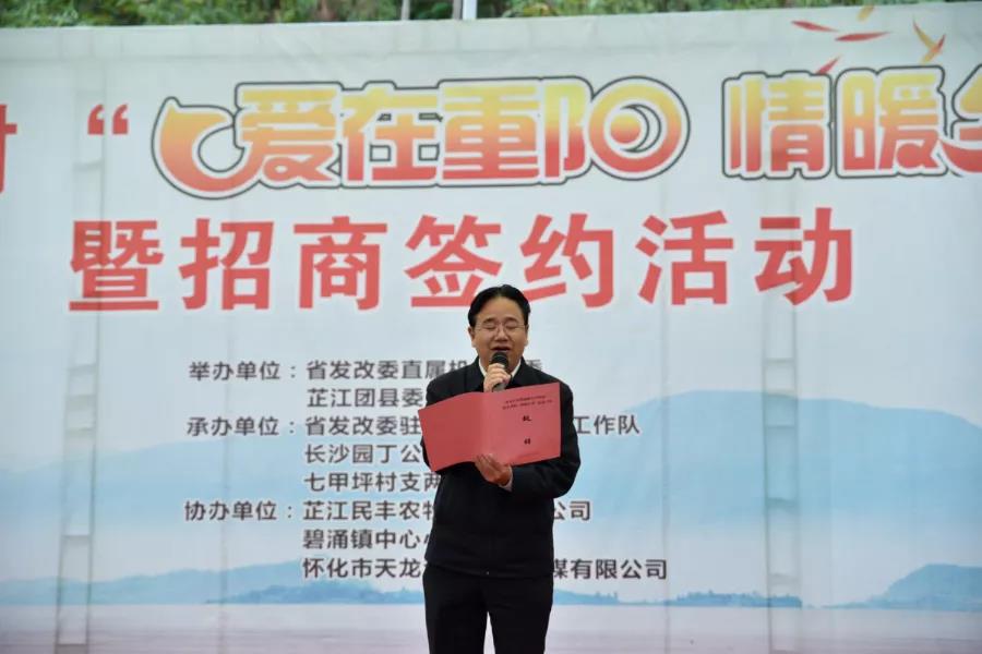 为弘扬中华民族尊老的优良传统,丰富老年人精神文化生活,关爱七甲坪村老年人,10月14日,由湖南省发改委直属机关团委、芷江县团委联合主办,省发改委驻七甲坪帮扶工作队、长沙园丁公益国学讲习所、七甲坪村支两委承办的“爱在重阳,情暖乡村”、“隆平文化驿站·高能环境七甲坪村站”授牌仪式在芷江县碧涌镇七甲坪村举行。