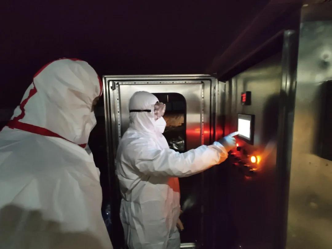 针对上述问题,高能环境团队启用其独有的“医疗废物处置系统”。该系统以移动式医疗废物焚烧方舱为主要设施,配置自动提升、破碎进料装置,可对医疗废物进行车载式小型焚烧、高温热解,同时利用集成高效的烟气净化设备,减少二次废物,该系统还具备自动清洗、紫外线消毒功能,可24小时持续运行,有效处置了疫情防治所产生的口罩、防护服、鞋套等高感染性废物。